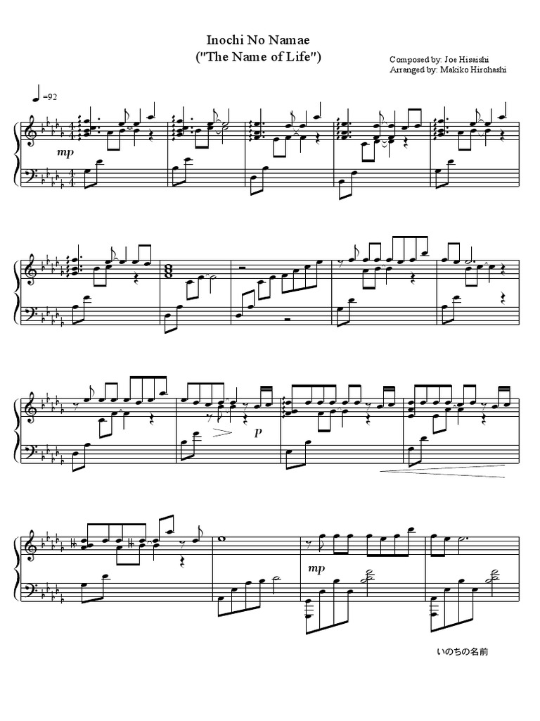 Spirited Away Inochi No Namae Piano Sheet Music Collingjb